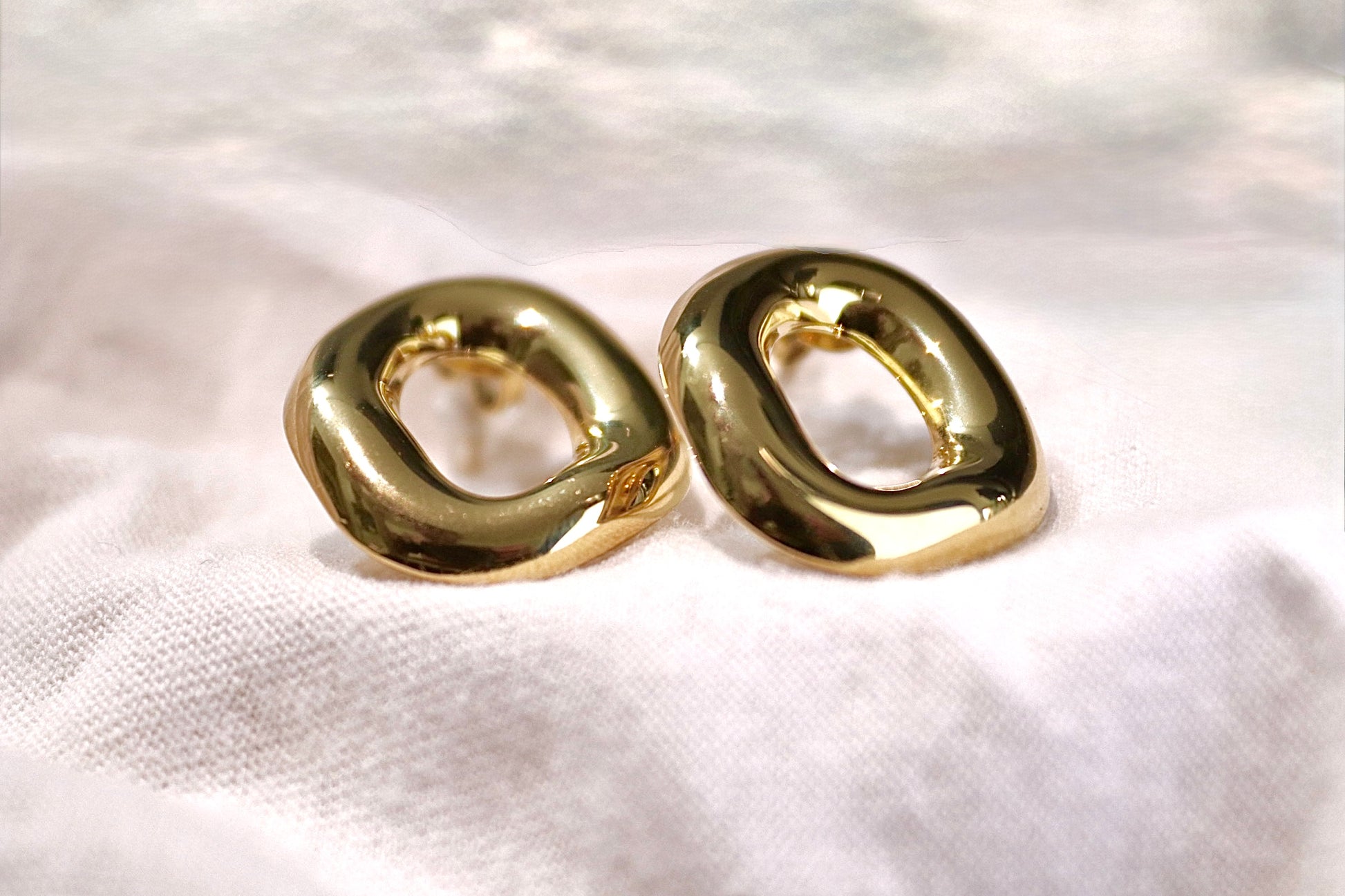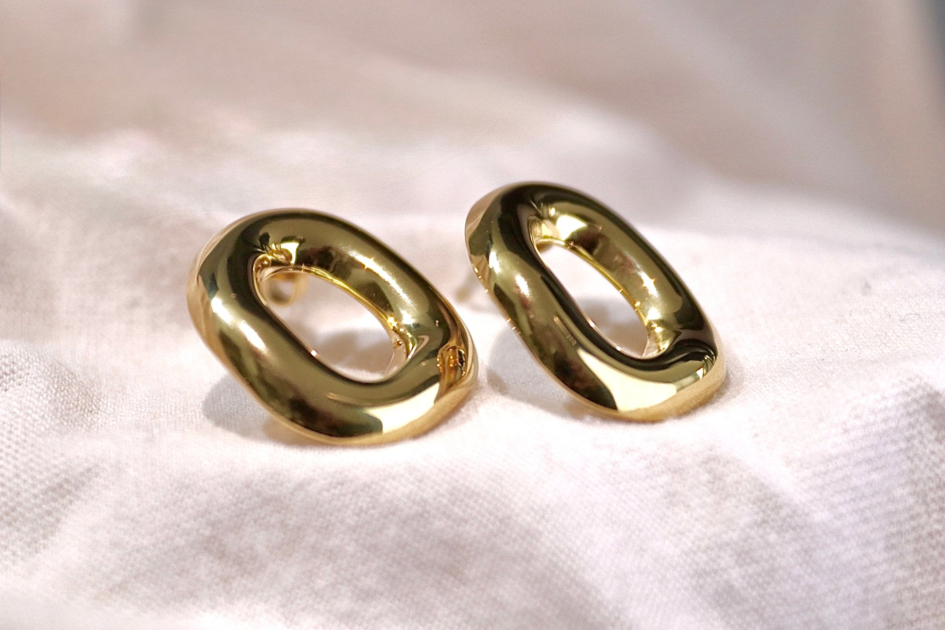 Orecchini a lobo a forma ovale irregolare, spessore pronunciato ma non per questo pesanti, il loro aspetto è iper moderno.